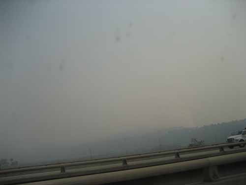 この煙がLA地区の南側を覆っているようです。Anaheim もこんな感じで(ホテルの大きくて強力な空調設備でも、煙の匂いには勝てませんでした)、San Juan Capistranoまでの道はどこもこんな感じでした。