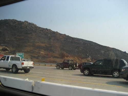 Rancho Bernardo に大統領に訪れたため、15号線の West Bernardo 出口辺りからものすごい渋滞 -- 当然のことながら、みんなはアシスタンスセンターに行くべきだと話していました。後ろの方に、燃えてしまった West Bemardo の丘が見えます…