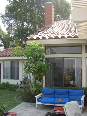 我が家の無事な姿です。.でも、調べてみると屋根のタイルが無くなっていました。ずいぶんと風が強かったようです。めちゃくちゃになった中庭と、へこんでしまったキャンピンググリルが見えます。